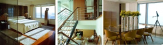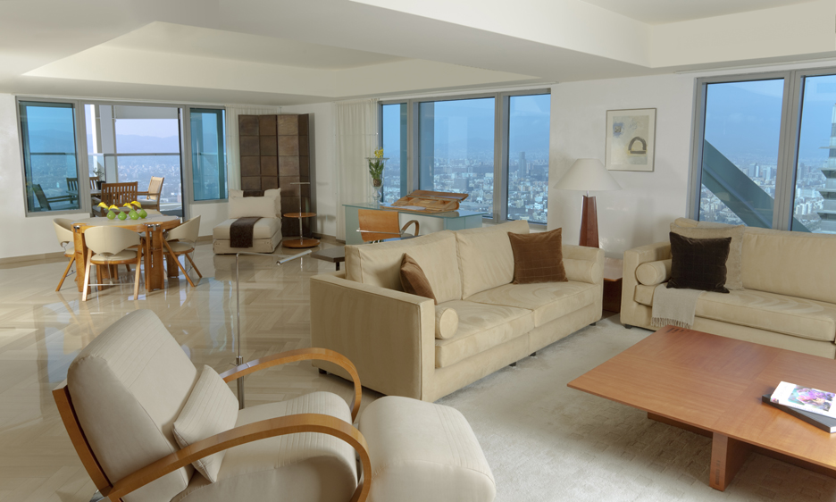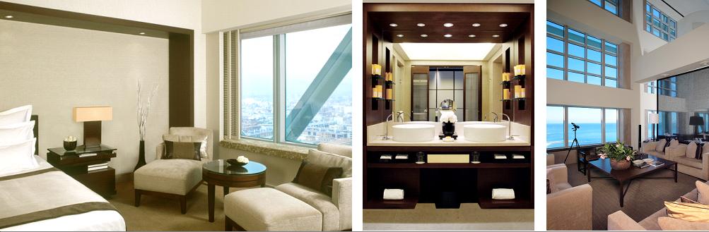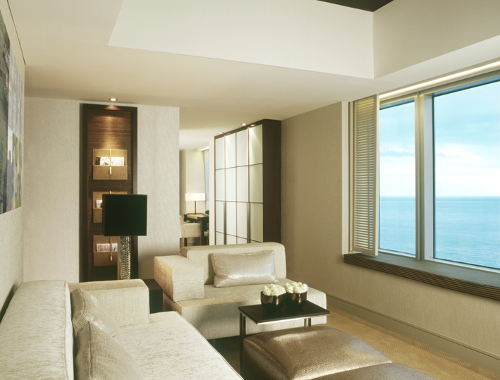 Japanese Suite. Японский люкс, оформленный в восточном стиле и находящийся на 30-м этаже, расположен по всей длине фасада здания, выходящего на море. Его планировка отличается чистотой линий и незагроможденностью; люкс разделен на два крыла, одно из которых предназначено для приема посетителей и включает гостиную, столовую и кухню, а в другом царит более домашняя атмосфера. Система дверей и окон с элементами эстетики дзен фильтрует свет, создавая спокойную, эксклюзивную, современную и комфортную атмосферу.