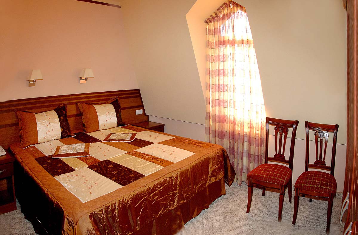 Простор и богатый уникальный интерьер каждого из 4х номеров люкс-класса даёт вам возможность чувствовать себя в безопасности и неге вдали от городской суеты, а расслабление в джакузи с ароматными маслами – чувство, что жизнь прекрасна! Диван превращается в дополнительную кровать, еще одну мы всегда можем поставить по вашему желанию. В каждом люксе вы найдете спутниковое телевидение и заполненный мини-бар, а за окном – милый балкончик и вид на главную площадь города. Номера Люкс идеально подходят как для семейного отдыха, так и для приятного уединения.