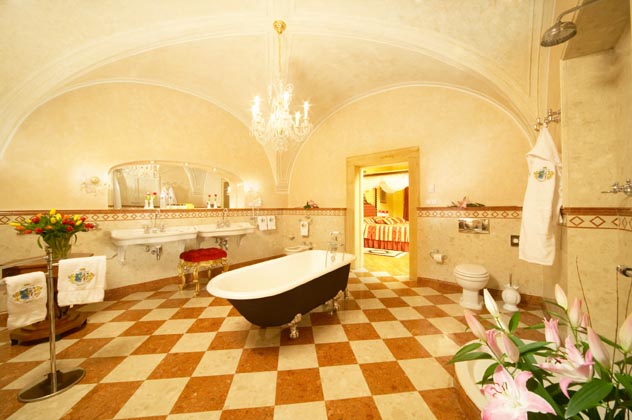 Imperial Suite: 96 м2. Двухуровневый номер, состоит: на первом этаже — гостиная с обеденной зоной, кухня, спальня, ванная комната, балкон, на втором этаже — спальня, ванная комната с душем и окном, выходящем на Пражский замок. Выходит во внутренний дворик с садом и на улицу Tržišté.