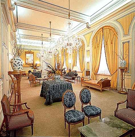 Во всех номерах – элегантные интерьеры в классическом стиле: высокие потолки с лепниной, красиво драпированные тяжелые шторы, хрустальные люстры, изящная мебель, изысканные украшения и предметы антиквариата.