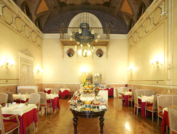 Suite — элегантный номер, декорированный в стиле эпохи Ренессанса, с потолками, обшитыми деревянными балками, драпировками из дорогих тканей, изысканными гобеленами, состоят из спальни, гостиной, большой ванной комнаты, выходит во внутренний дворик отеля и на старинные улицы города.