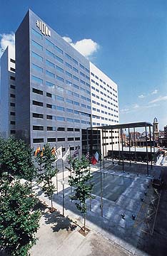 Внешний фасад здания Hilton Barcelona отражает качество всех отелей, принадлежащих этой сети. Половина здания из темно-коричневого мрамора, а другая белая. Большой навес дополняет внешний облик здания. У входа расположены две большие вращающиеся двери, через них гости входят в просторный и хорошо оформленный вестибюль. В вестибюле современная и элегантная мебель и два подлинных настенных гобелена знаменитого каталонского художника Хоана Миро (Joan Miro).
