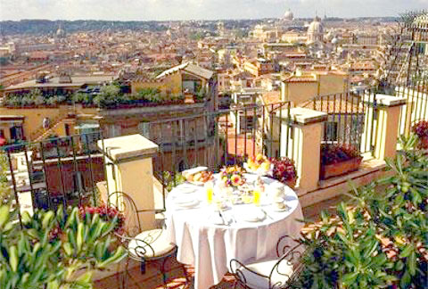 Top Suite — изысканные номер, расположенный на последнем этаже отеля, с просторной гостиной с обеденной зоной, камином, спальней, ванной комнатой, живописной террасой с панорамным видом на Рим.
