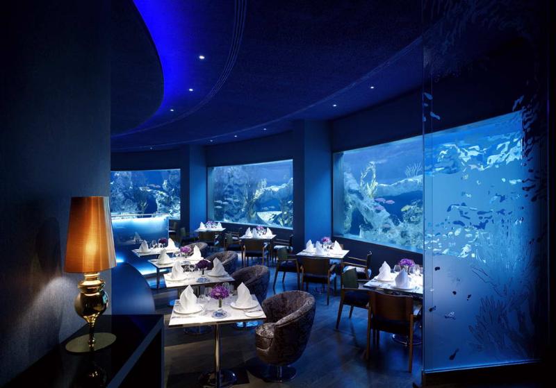 Aquamarine — уникальный ресторан, расположенный в центре огромного бассейна, в окружении 4 аквариумов с рыбами из разных морей мира. Здесь подаются деликатесы из морепродуктов.