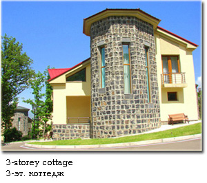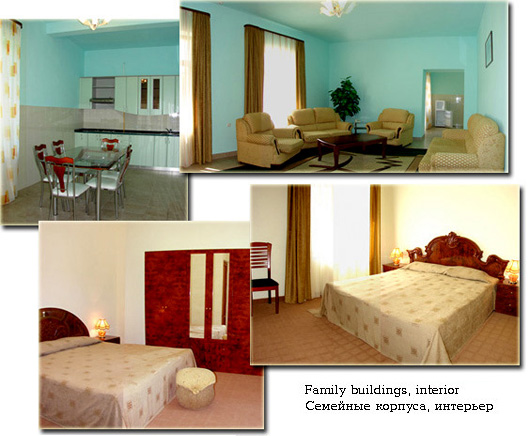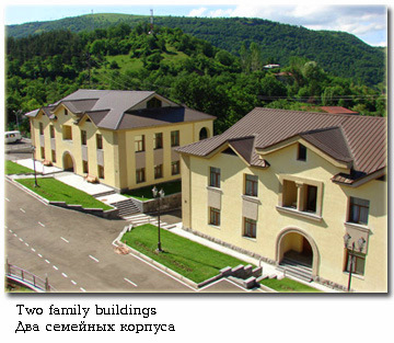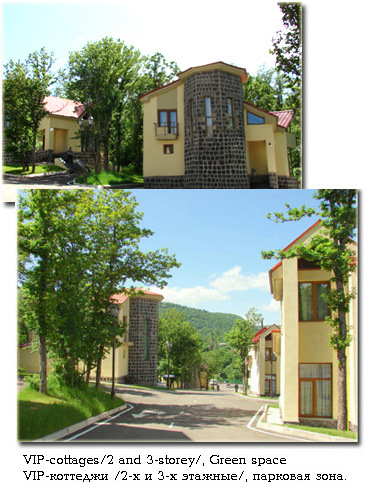 центральный корпус, два семейных корпуса, 15 VIP-коттеджей, спортивные площадки /мини-футбол, волейбол, баскетбол, теннис/ и детская площадка, автостоянки, парковая зона.