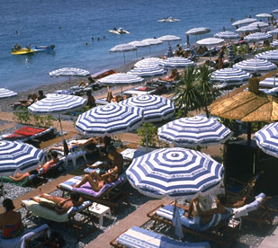 Имеется собственный платный галечный пляж через дорогу; рядом с каждым шезлонгом или зонтом поставлены оригинальные стильные кашпо с зелеными растениями, пальмами или цветами.