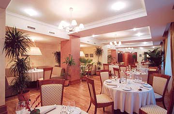 - Элегантный ресторан с колоннами из светлого мрамора, огромными люстрами, темно-красными стенами и темной сосновой мебелью расположен на нижнем этаже отеля.